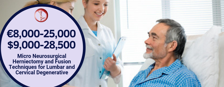 The package price for micro neurosurgical herniectomy and fusion techniques for lumbar and cervical degenerative is around 8,000-25,000 Euros, which is$9000-$28,500 approximately. The package price also depends on the number of lumbar or cervical discs to be treated with fusion systems. Final prices are determined after physical evaluation and laboratory report analysis.